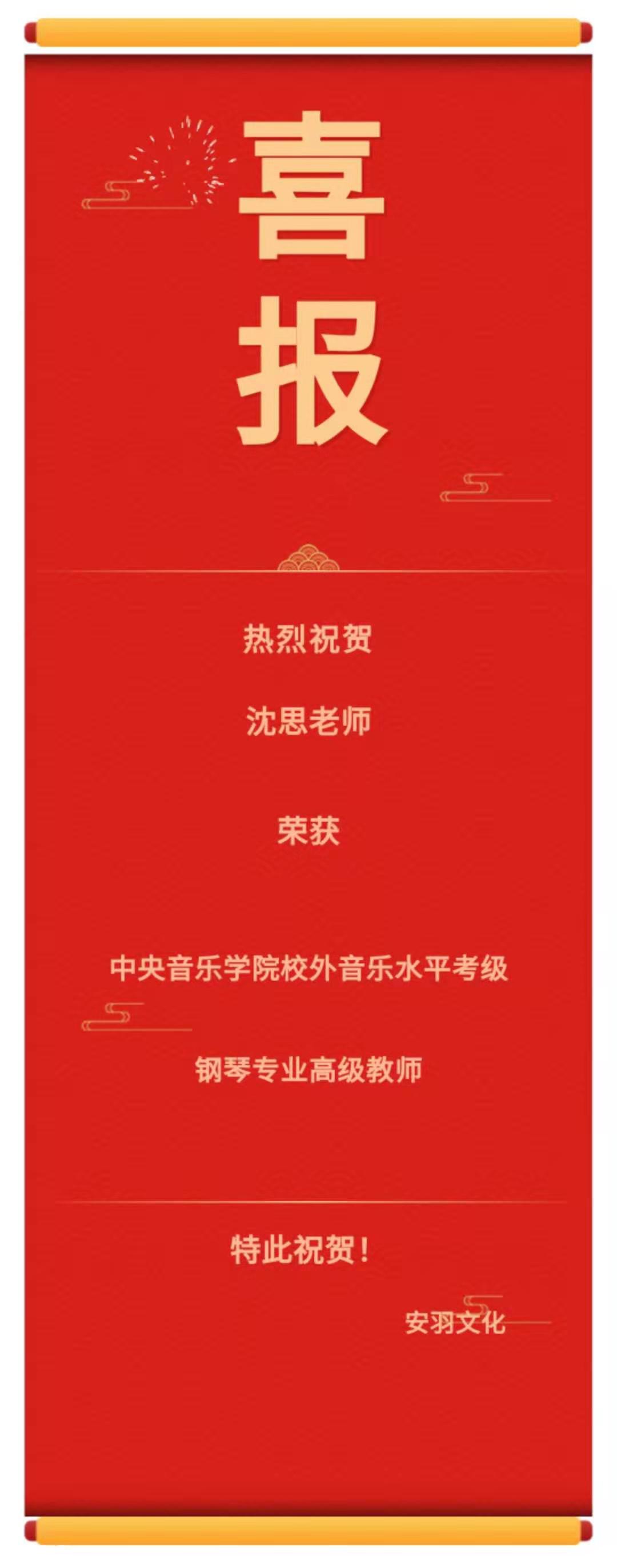 沈思老师荣获中央音乐学院校外音乐水平考级钢琴专业高级教师