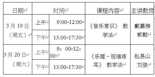 1、《音乐常识》教学法。系统讲解《音乐常识》(初级)教材的编写思路、教学方法、考试形式并进行授课示范。