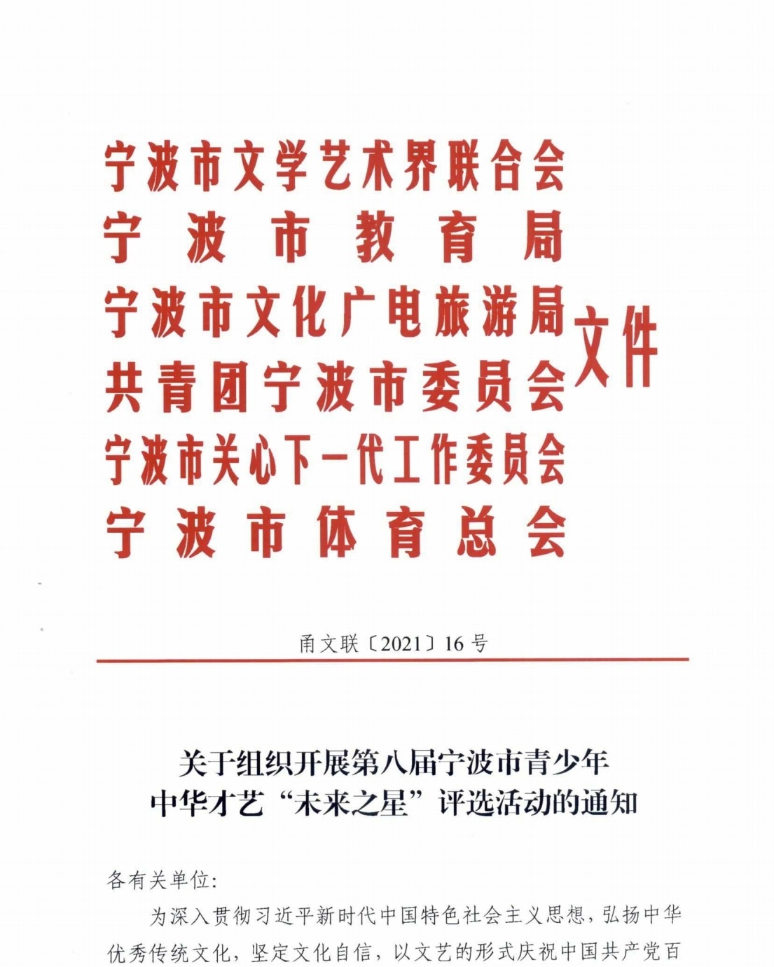 为深入贯彻习近平新时代中国特色社会主义思想,弘扬中华优秀传统文化,坚定文化自信,以文艺的形式庆祝中国共产党百年华诞,全面展现我市青少年中华才艺教育的丰硕成果,经研究,决定在全市范围内组织开展第八届宁波市青少年中华才艺“未来之星”评选活动。本活动为公益性评选。