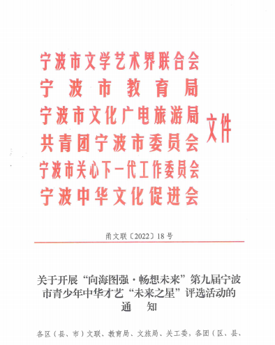 由于国内疫情反复,原定暑期由宁波市文学艺术界联合会、宁波市教育局、宁波市文化广电旅游局、共青团宁波市委员会、宁波市关心下一代工作委员会和宁波中华文化促进会等6部委主办的第九届宁波市青少年中华才艺“未来之星”公益评选,大赛时间点恰逢开学季,为保证广大参赛学生的安全,在广泛征求意见后,经报第九届“未来之星”组委会商议后决定:延期举办第九届宁波市青少年中华才艺“未来之星”·表演类(戏剧、舞蹈)评选,有关事项变更如下: