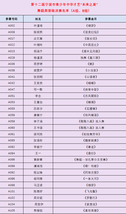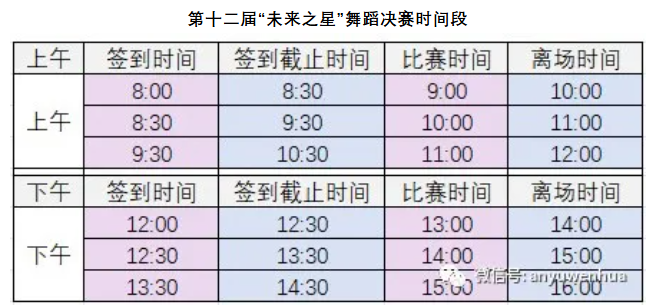 第十二届“未来之星”舞蹈类晋级决赛的选手,8月15日前赛务老师会把具体的比赛时间段以电话、微信等方式逐一通知到晋级决赛选手本人或机构老师、家长,请关注“安羽文化”公众号,注意查收决赛参赛信息通知。未接到决赛通知的选手本轮比赛为未晋级。